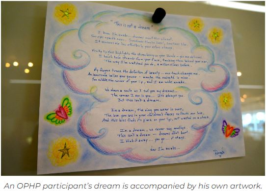 At the invitation of Nancy Buenger’s UW School of Library & Information Studies class “Topics in Community Engagement” and the Dream Collectors Project, OPHP participants were asked to share their dreams through narratives or drawings. Their submissions were included in the project’s kick-off session at the Madison Public Library’s Bubbler space and remained there through March 2015.